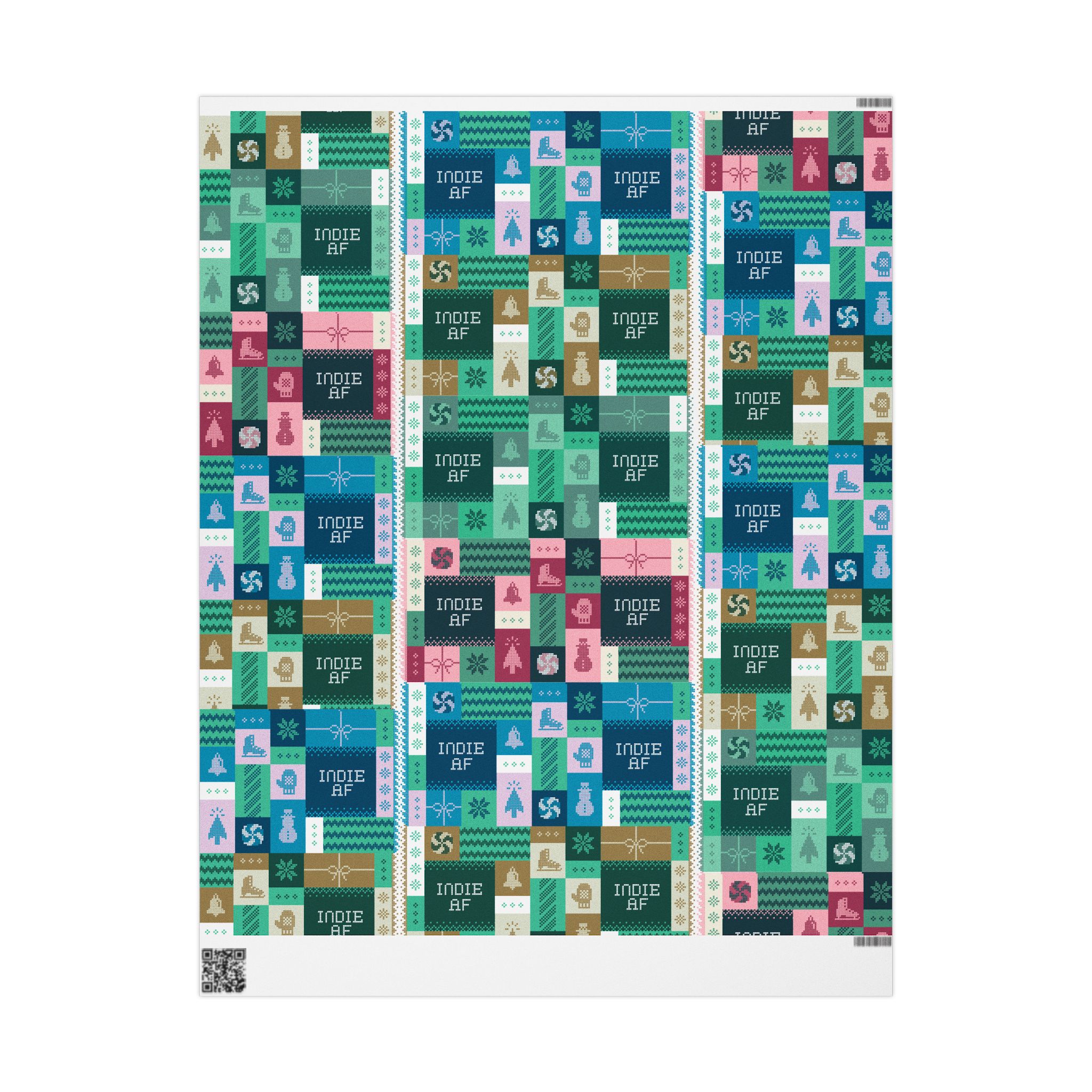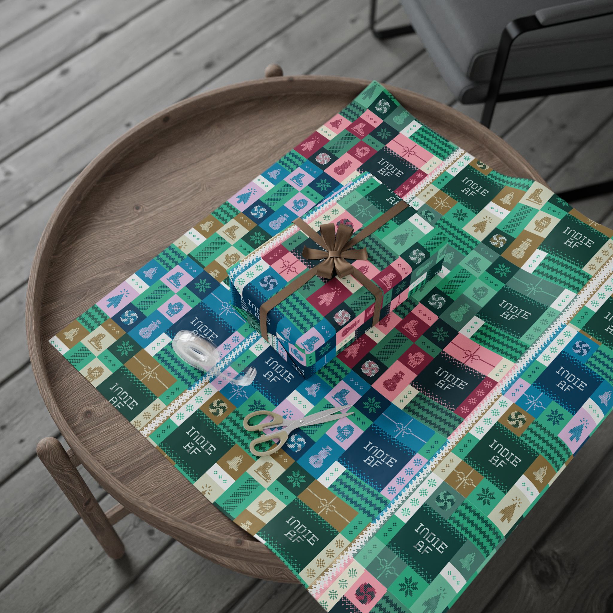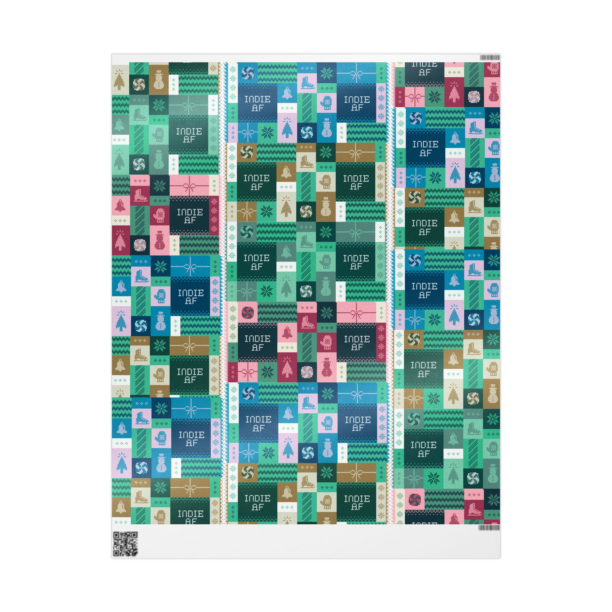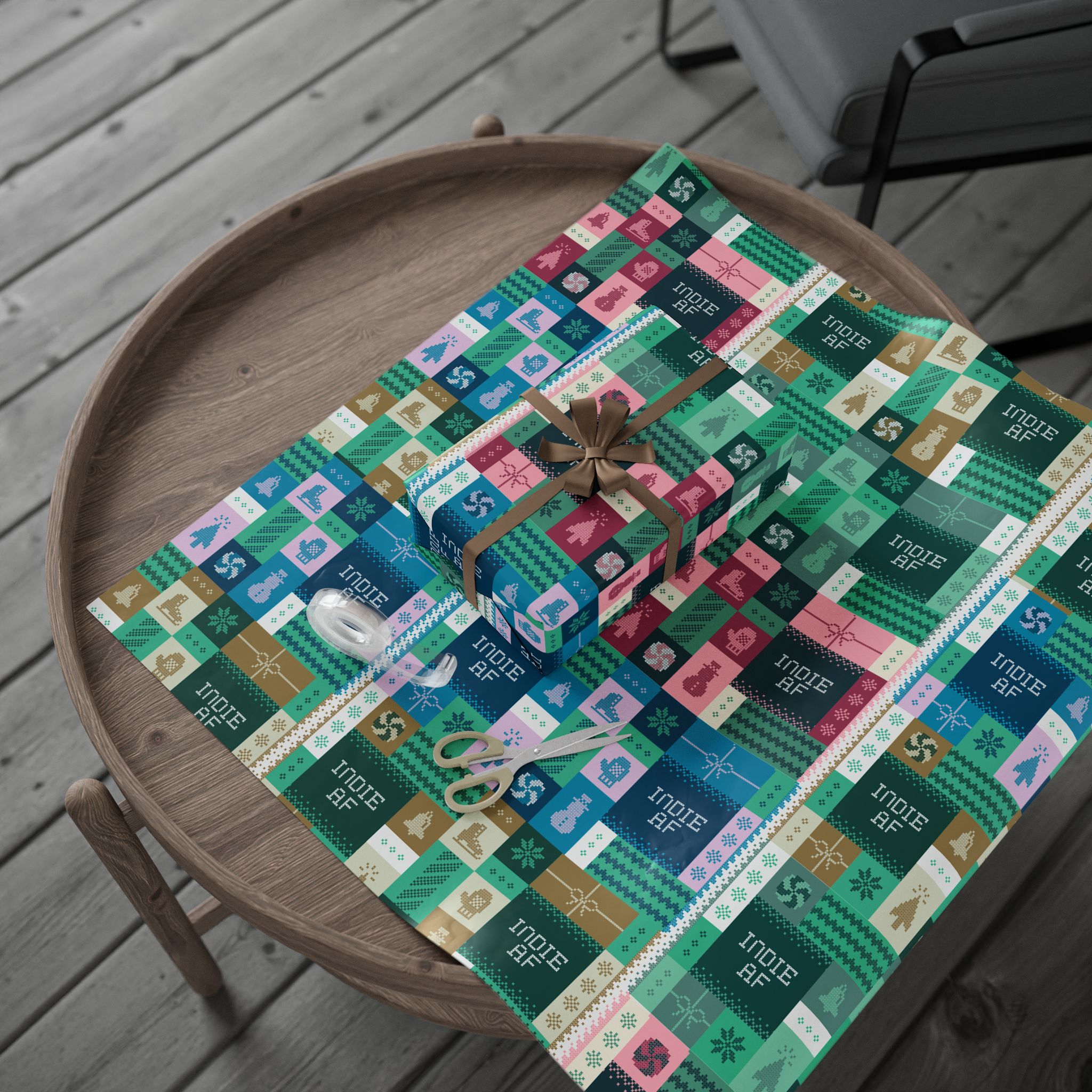 This wrapping paper features our full holiday pattern in repeating glory – trees, snowflakes, bells, mittens, and “INDIE AF” scattered throughout like a festive pixel quilt designed by Grown for people who appreciate efficiency in all things, including subtle encouragement.