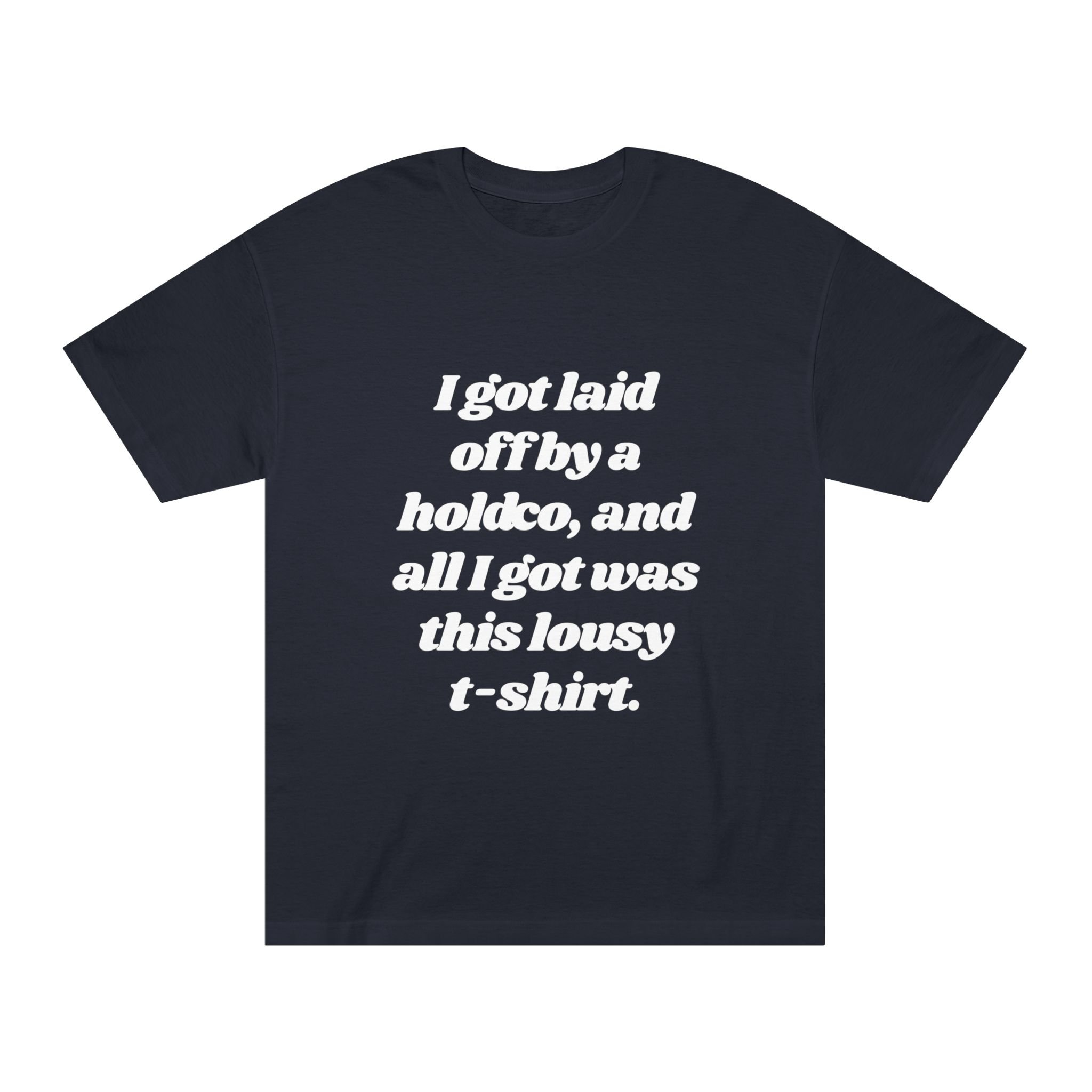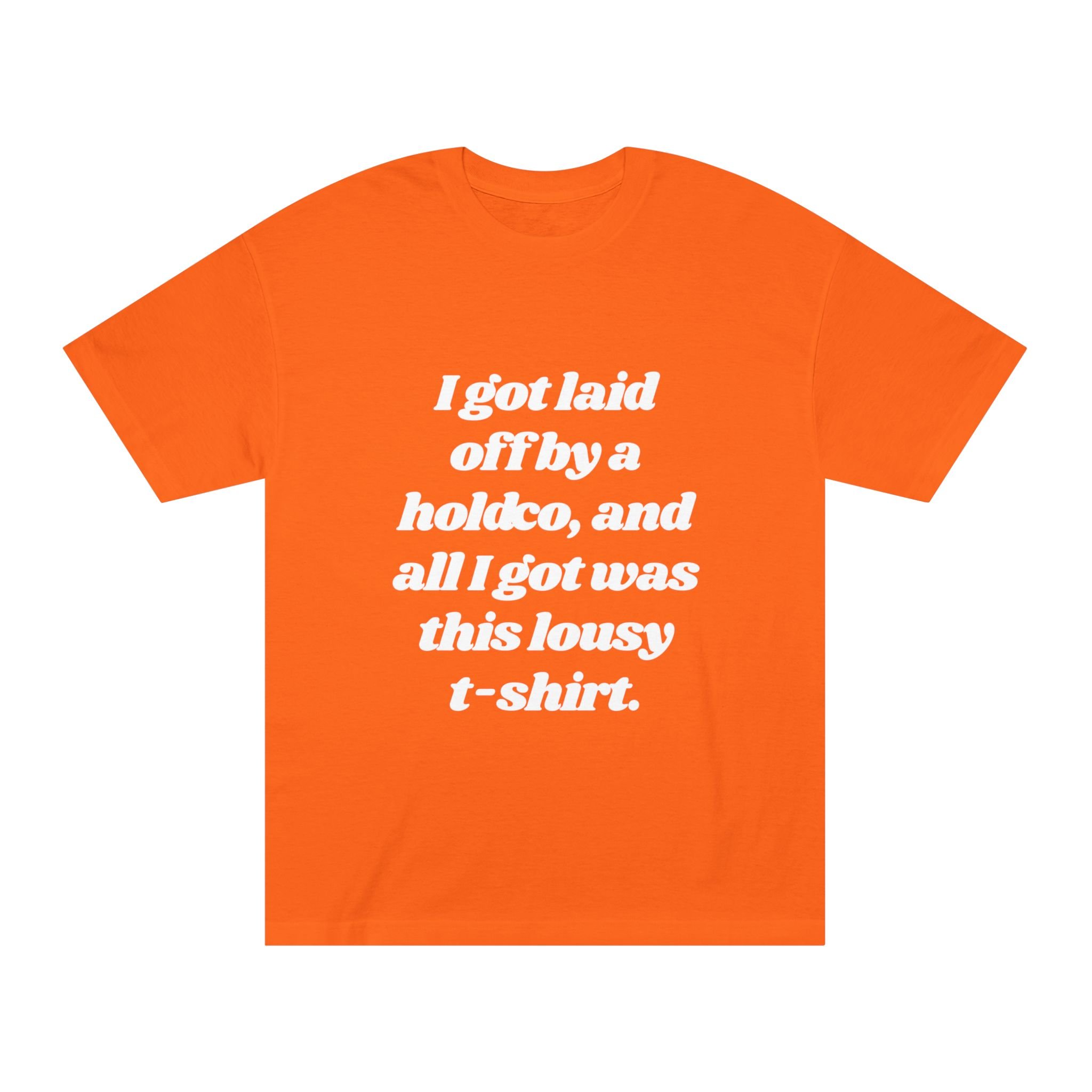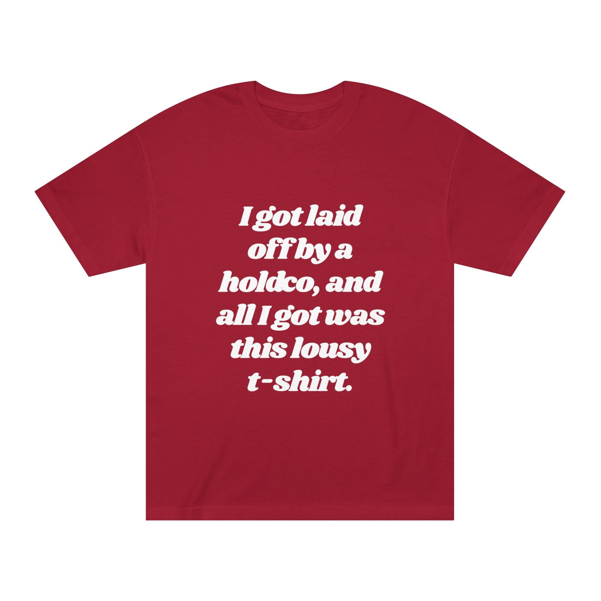 ACT ONE (THE FRONT): The day they laid you off, Karen from HR said “we’re restructuring” like that made it hurt less. She handed you a box for your desk stuff – a box that was, ironically, too small for your desk stuff – and walked you out past the intern who wouldn’t make eye contact. The front of this shirt memorializes that exact moment: “I got laid off by a holdco, and all I got was this lousy t-shirt.”